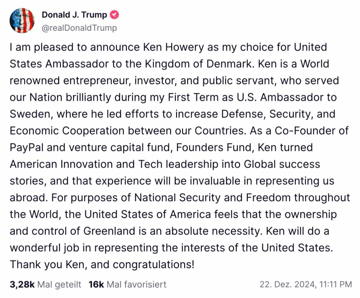 Bereits Mitte 2019 schlug er als 45. Präsident vor, Grönland zu kaufen, was jedoch von Dänemark, zu dessen Staatsgebiet die Insel seit 1814 gehört, mit deutlichen Worten abgelehnt wurde. Vor wenigen Tagen machte Trump in einem Social-Media-Post anlässlich der Ernennung des neuen US-Botschafters für Dänemark deutlich, dass er weiterhin an diesem Vorhaben festhält.