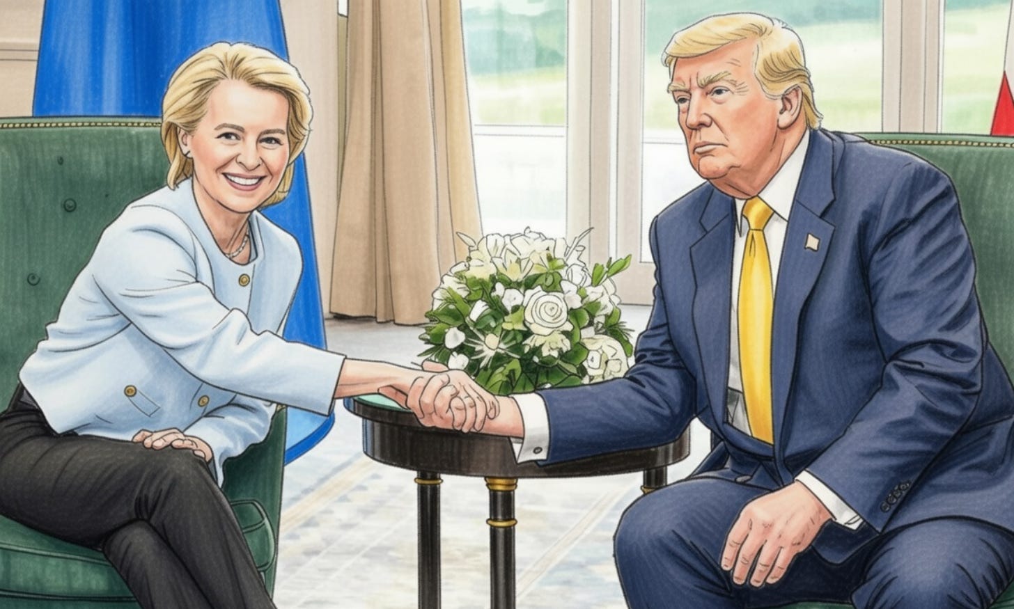 Im Sommer 2025 erlebt die Welt eine bizarre Szene: Nach Abschluss der Handelsvereinbarung zwischen den USA und der EU reichten sich US-Präsident Donald Trump und EU-Kommissionspräsidentin Ursula von der Leyen die Hand. Trump behielt sein Pokerface und von der Leyen grinste, als hätte sie gerade ein gutes Geschäft gemacht. Die Realität war jedoch, dass sie von Trump gnadenlos über den Tisch gezogen wurde.
